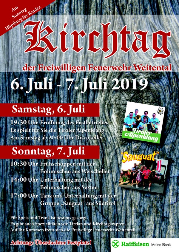 | Sa., 06.07.2019 | I - Weitental | Freiwillige Feuerwehr | Überdachter Festplatz | Kirchtag der FF Weitental | - 20:00 - |