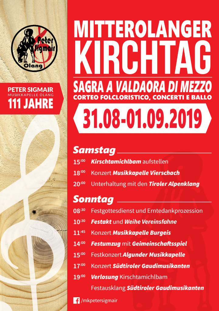 | Sa., 31.08.2019 | I - Olang | Musikkapelle Peter Sigmair Olang | Festplatz Mitterolang | Mitterolanger Kirchtag | - 20:00 - |