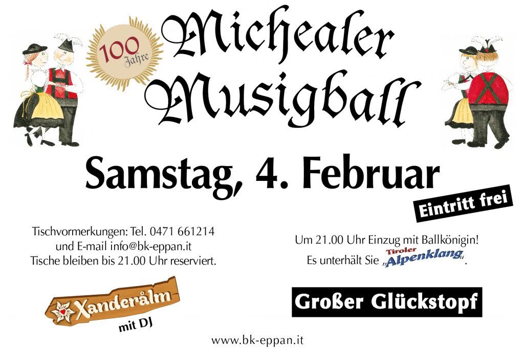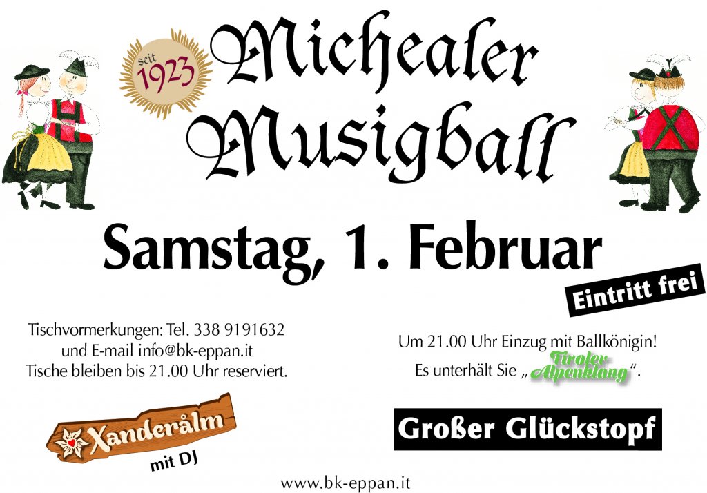 | Sa., 01.02.2020 | I - St. Michael - Eppan | Bürgerkapelle St. Michael - Eppan | Raiffeisensaal | Michaeler Musigball | - 20:30 - |
