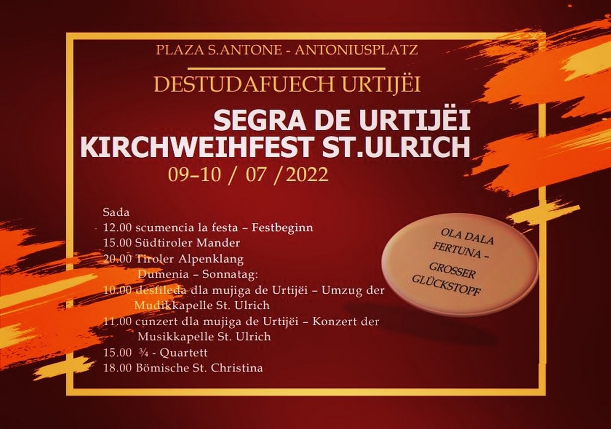 | Sa., 09.07.2022 | I - St. Ulrich - Gröden | Freiwillige Feuerwehr | Antoniusplatz | Zeltfest | - 20:00 - |