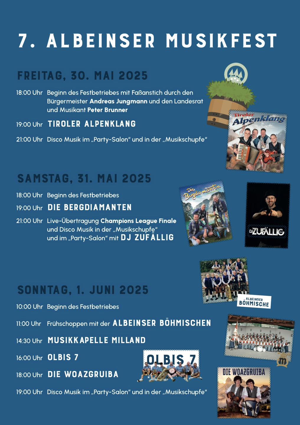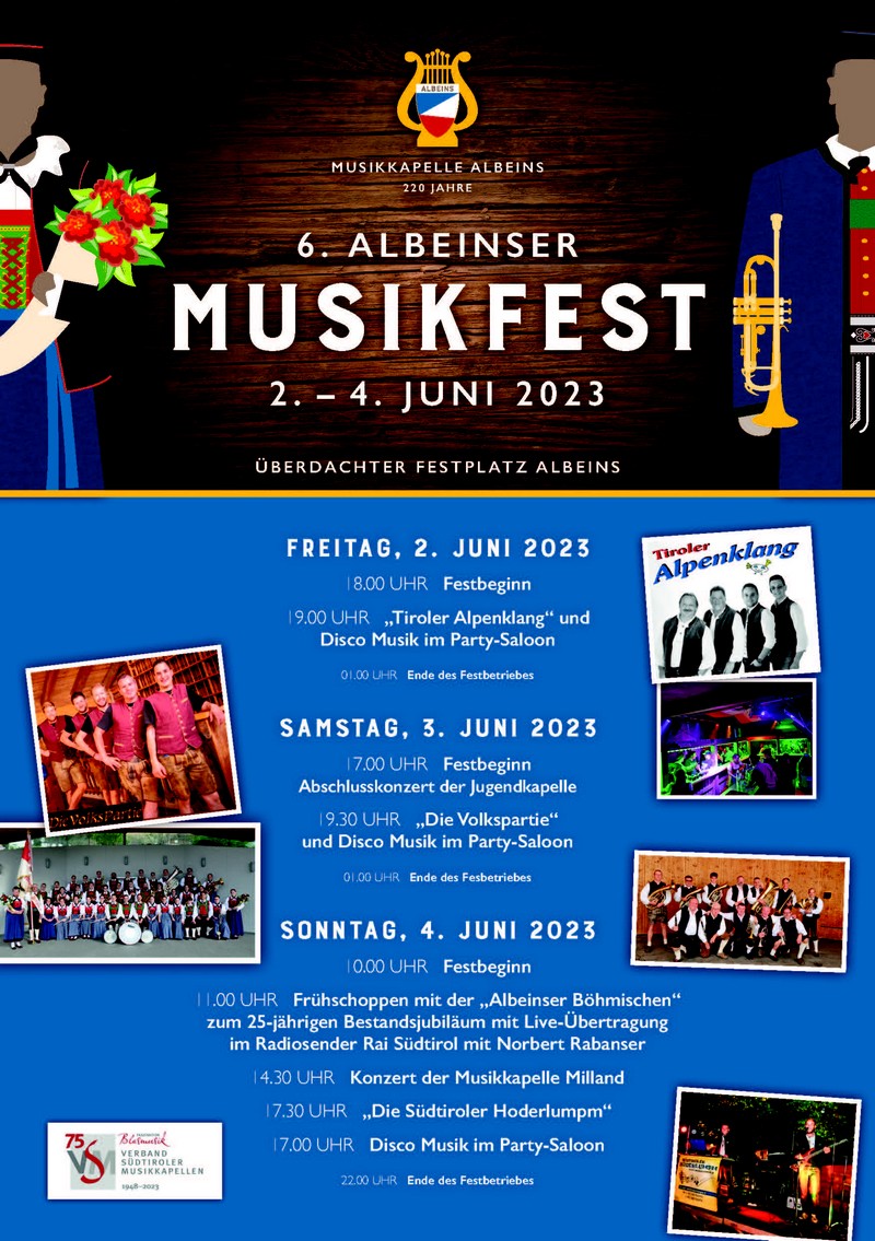 | Fr., 02.06.2023 | I - Albeins-Brixen | Musikkapelle Albeins | Überdachter Festplatz Albeins | 6. Albeinser Musikfest | - 19:00 - |