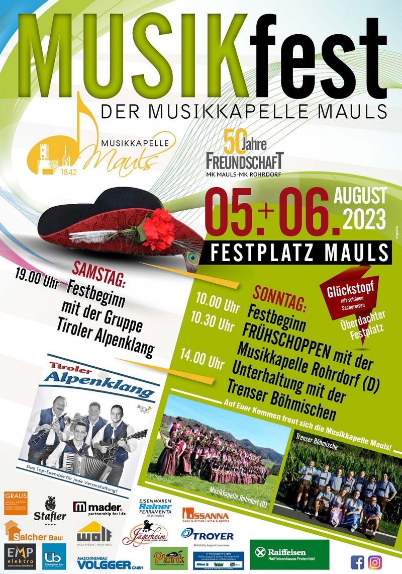| Sa., 05.08.2023 | I - Mauls | Musikkapelle Mauls | Festplatz Mauls | Musikfest | - 20:30 - |