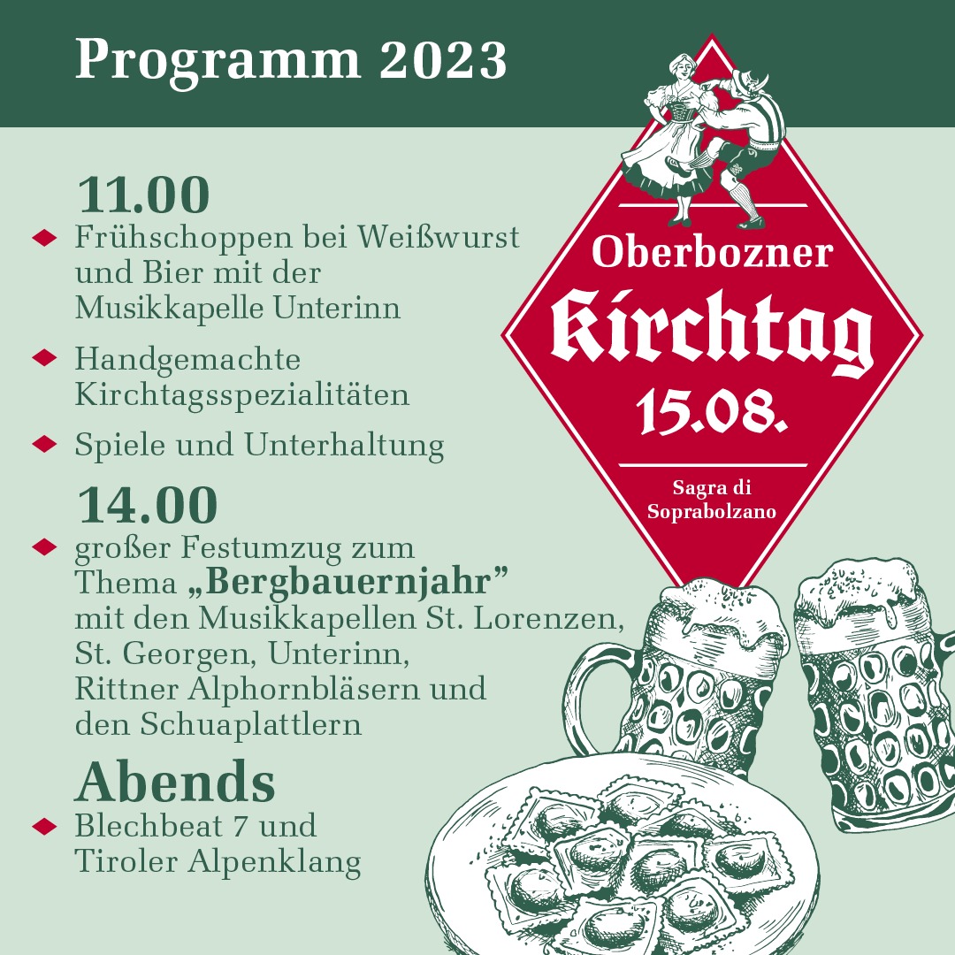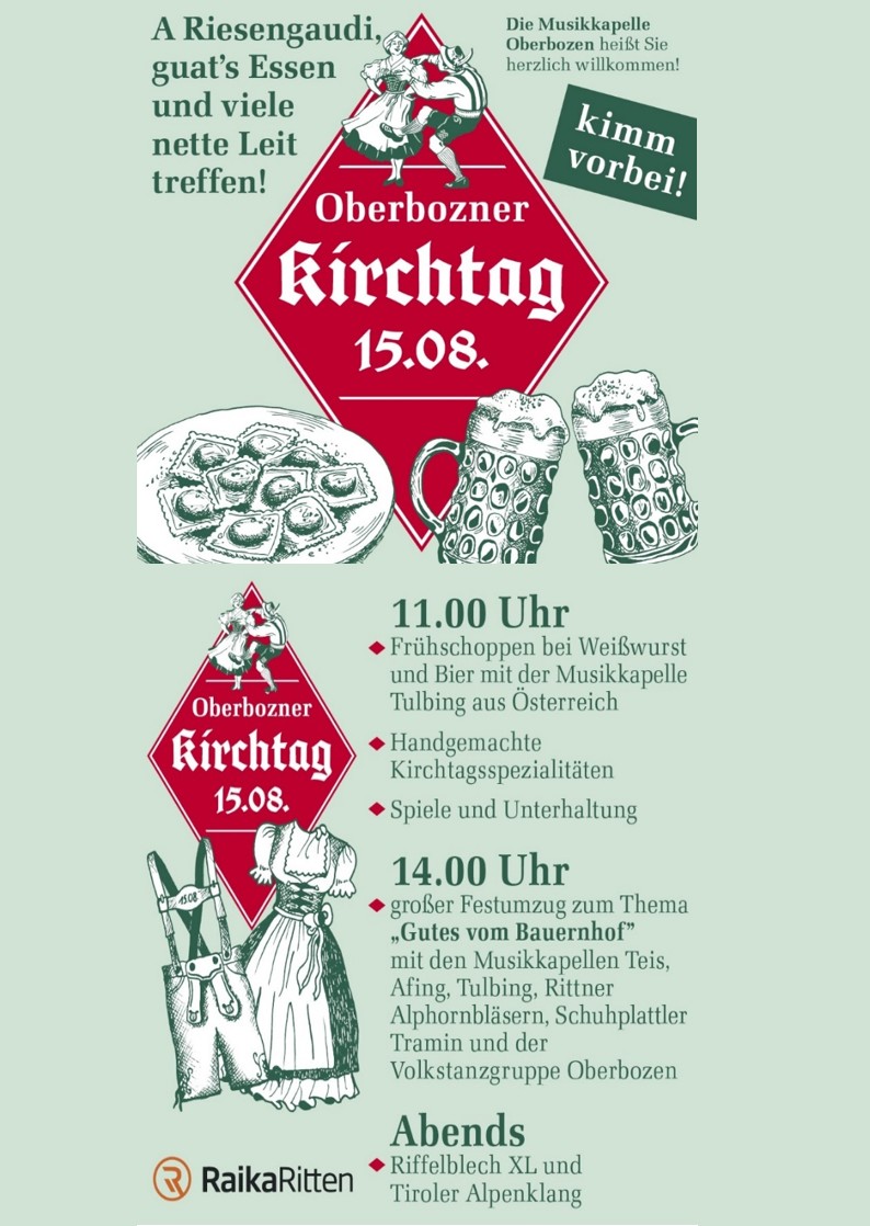 | Di., 15.08.2023 | I - Ritten / Oberbozen | Musikkapelle Oberbozen | Festplatz | Oberbozener Kitchtag | - 20:00 - |