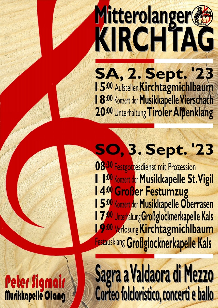 | Sa., 02.09.2023 | I - Olang | Musikkapelle Peter Sigmair Olang | Festplatz Mitterolang | Mitterolanger Kirchtag | - 20:00 - |