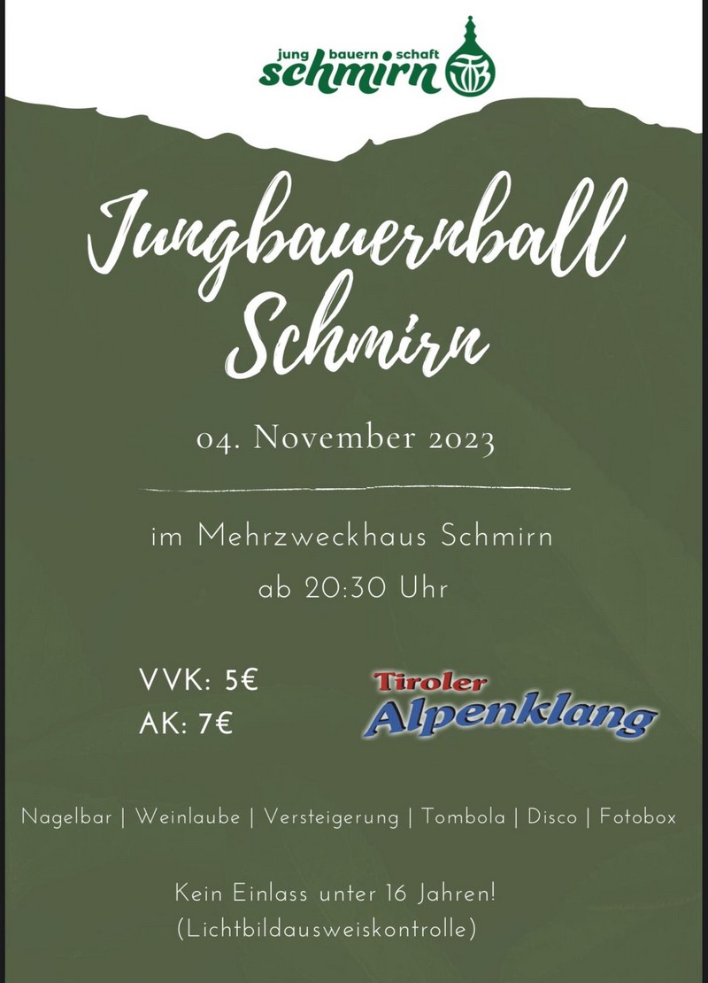 | Sa., 04.11.2023 | A - Schmirn | Jungbauernschaft Schmirn | Mehrzweckhaus Schmirn | Jungbauernball Schmirn | - 21:00 - |