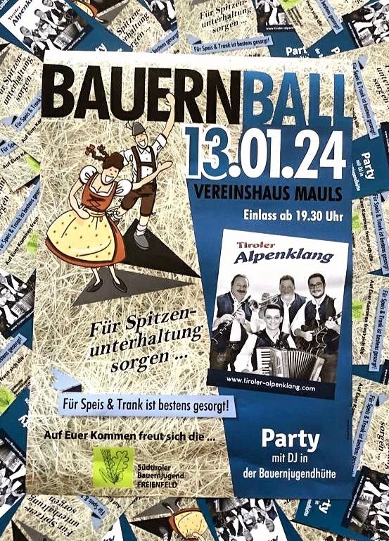 | Sa., 13.01.2024 | I - Mauls | Bauernjugend Freienfeld | Haus der Dorfgemenschaft Mauls | Ball der Bauernjugend Freienfeld | - 20:30 - |