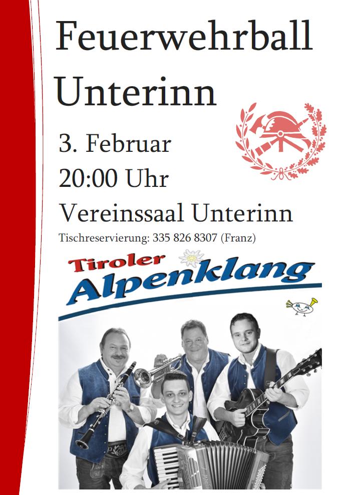 | Sa., 03.02.2024 | I - Unterrinn | Freiwillige Feuerwehr Unterrinn | Vereinssaal Unterrinn | Feuerwehrball | - 21:00 - |