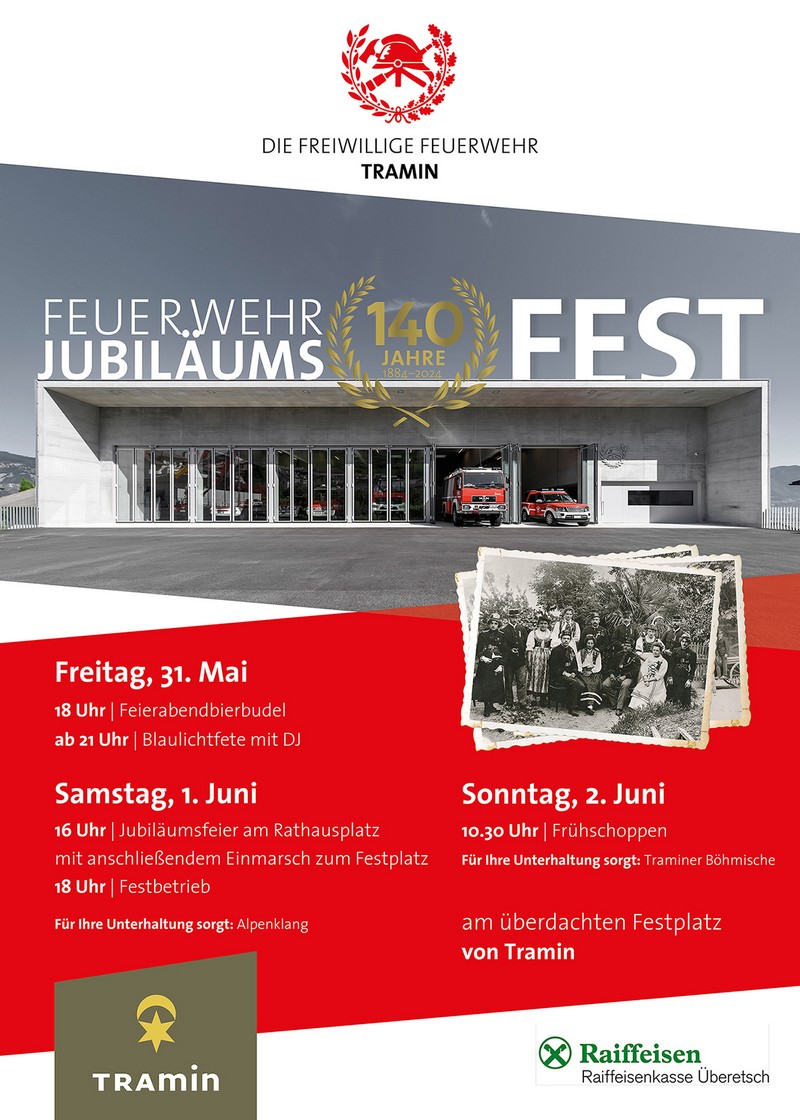 | Sa., 01.06.2024 | I - Tramin | Freiwillige Feuerwehr | Überdachter Festplatz | 140 Jahr Feier der FF Tramin | - 19:00 - |