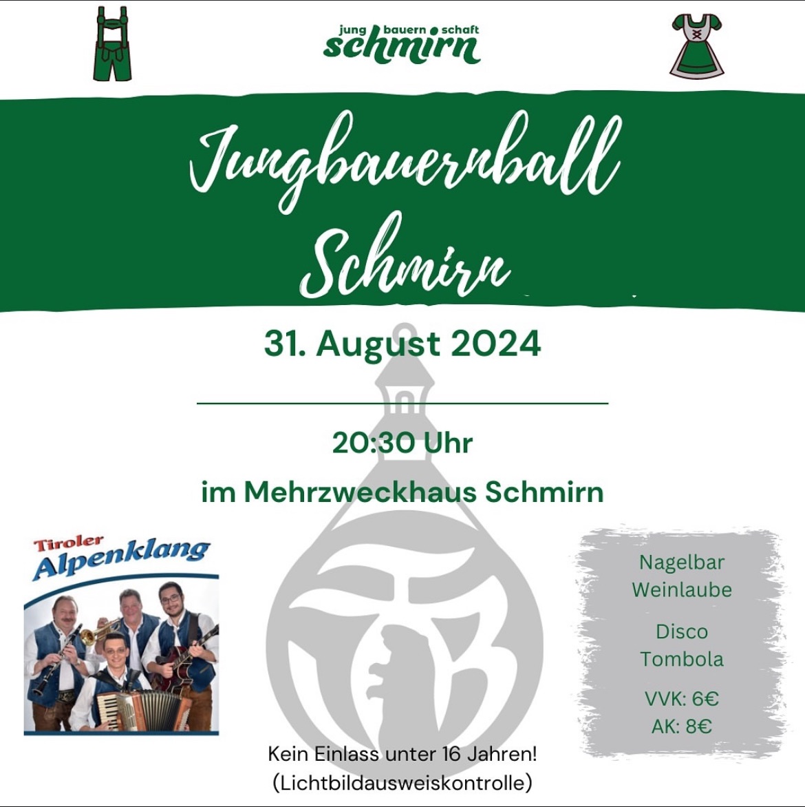 | Sa., 31.08.2024 | A - Schmirn | Jungbauernschaft Schmirn | Mehrzweckhaus Schmirn | Jungbauernball Schmirn | - 21:00 - |