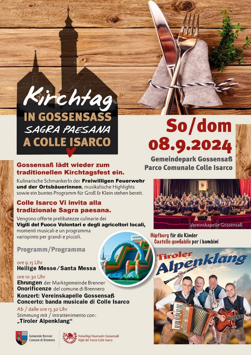 | So., 08.09.2024 | I - Gossensass | Gemeinde Brenner | Zeltfest beim Festplatz | Gossensasser Kirchtag | - 13:00 - |